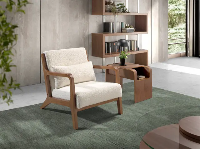 Fotelj iz oblazinjene tkanine in oreha, model 5100 Angel Cerdá S.L. Moderno oblikovan fotelj, oblazinjen v belo kodrasto tkanino, s sedežem in naslonom iz poliuretanske pene gostote 25 kg/m3, ki bo vašemu počitku zagotovila več udobja. Njegova konstrukcija iz masivnega jesenovega lesa, obarvanega v barvi oreha, z nasloni za roke vam bo dala pridih avantgarde in elegance, ki jo iščete za svojo dnevno sobo, jedilnico ali bralni kotiček. Ta fotelj s sodobnim dizajnom Angel Cerdá združuje edinstven slog in osebnost znamke ter največje udobje in stabilnost zaradi mehkega oblazinjenja in izvirne strukture nog. Popolna kombinacija oblikovanja in funkcionalnosti z velikim udobjem. STILNO: Ta oblazinjeni fotelj v beli kodrasti zasnovi tkanine bo v vaš dom vnesel izviren in eleganten dotik, ki ga iščete, zvest najnovejšim trendom na področju dekoracije. Vsestranski in funkcionalen: Elegantna in preprosta zasnova omogoča, da se prilega vsaki vrsti dnevne sobe, bralnega kotička ali spalnice ter postane glavni protagonist prostora. KAKOVOST: Vsi naši izdelki so izdelani iz materialov najvišje kakovosti, kar je zagotovilo za trajno in funkcionalno pohištvo. DEKORACIJA: Zaradi elegantne sodobne zasnove ter kombinacije med oblazinjenjem iz tkanine in strukturo iz jesenovega lesa v barvi oreha bo v vašem domu ustvaril drugačno in osebno vzdušje, kot ga iščete. UDOBJE IN DIMENZIJE: Velikost sedeža in oblazinjenje iz poliuretanske pene s prostornino 25 kg/m3 vam bosta omogočila največje udobje in eleganco v vašem domu. ZNAČILNOSTI: Naslonjalo in sedež sta oblazinjena s tkanino, ki je mehka na dotik in omogoča udobno sedenje. LEDVIČNA BLAZINA NI VKLJUČENA.