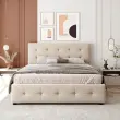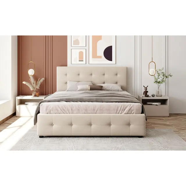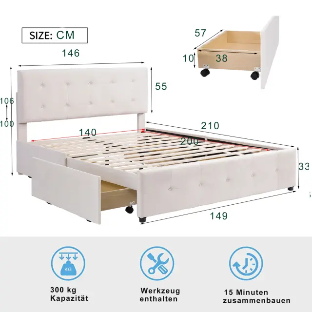 Oblazinjen žameten posteljni okvir 140x200 cm z dvojno posteljo in predali, letvenim dnom in vzglavjem - bež