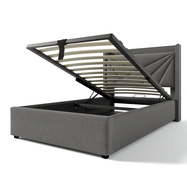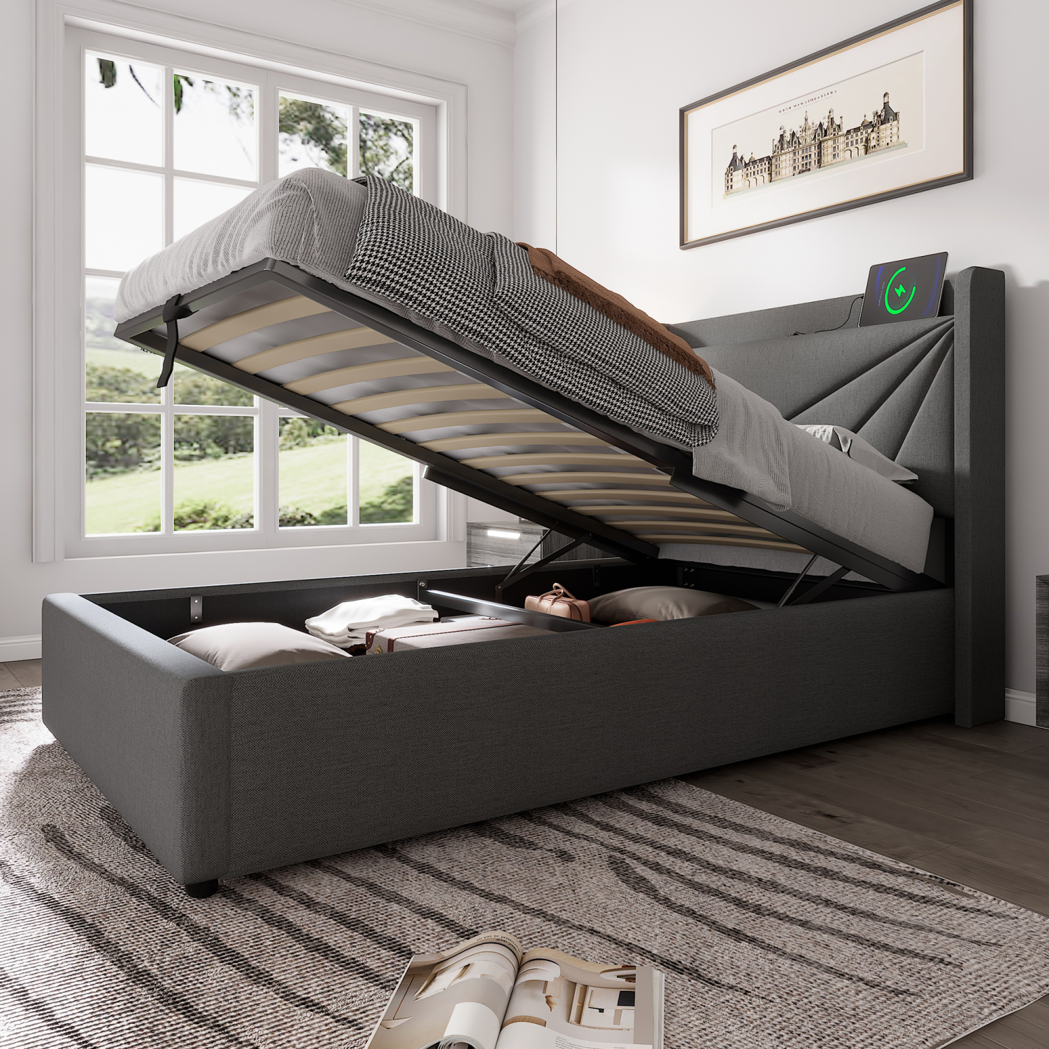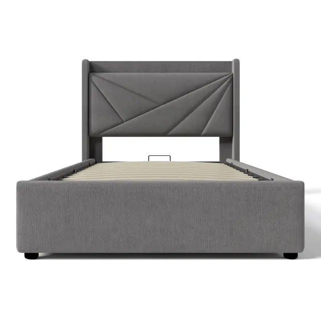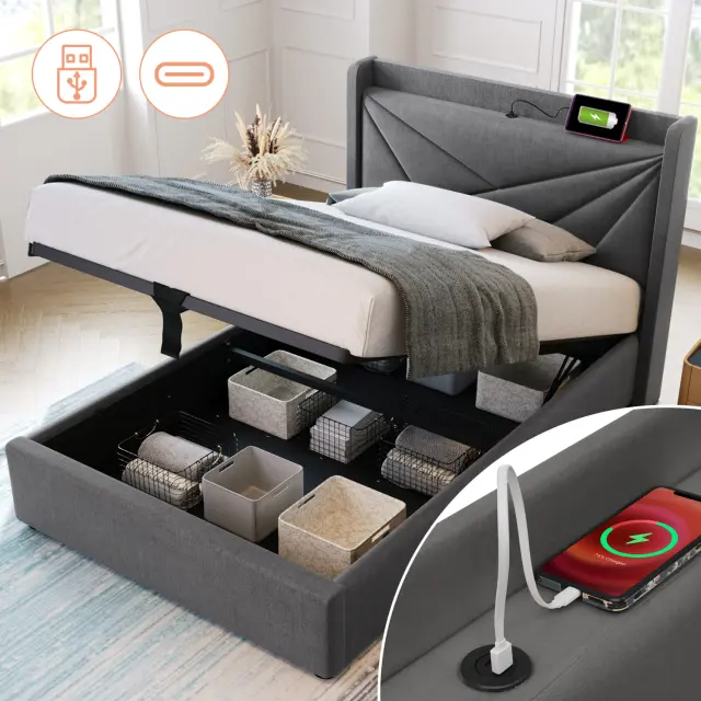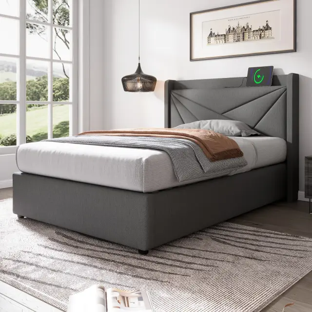Oblazinjena enojna postelja z vzglavjem USB-C, lanena otroška postelja 90x200 (brez vzmetnice)