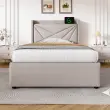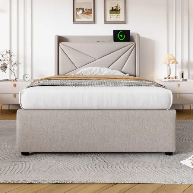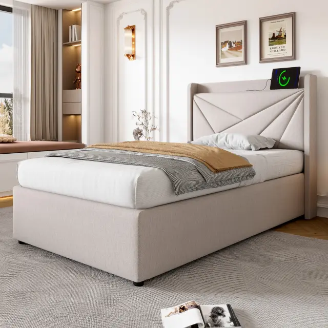 Oblazinjena enojna postelja z vzglavjem USB-C, lanena otroška postelja 90x200 (brez vzmetnice)