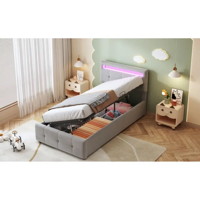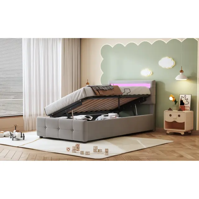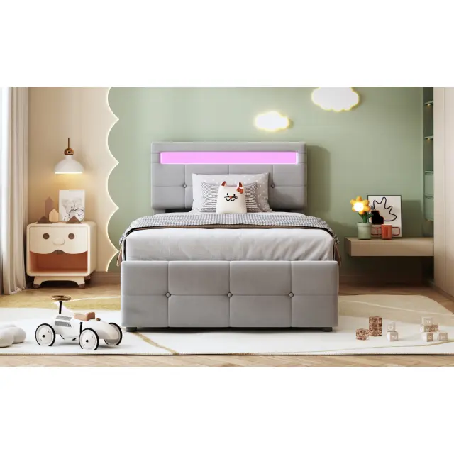 Oblazinjena otroška postelja 90x200 cm, LED osvetlitev, postelja s shranjevalnim prostorom, nastavljivo vzglavje, siva