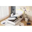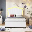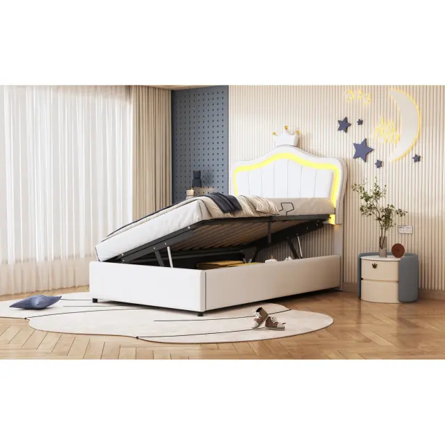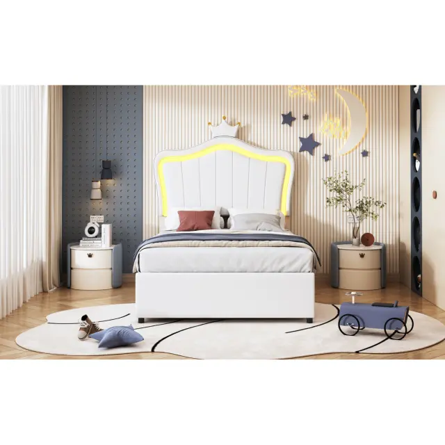 Oblazinjena otroška postelja 90x200 cm s krono in LED osvetlitvijo, postelja z odlagalnim prostorom, bela.