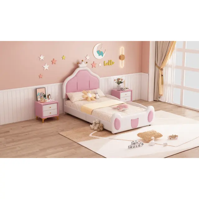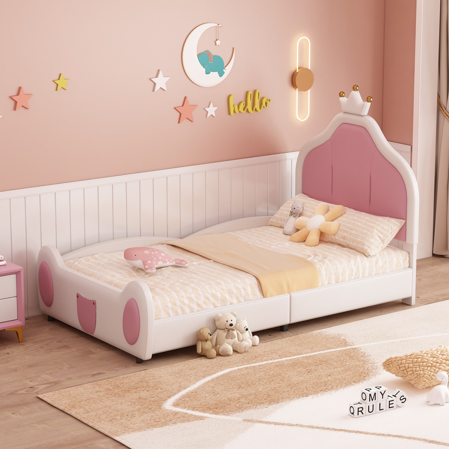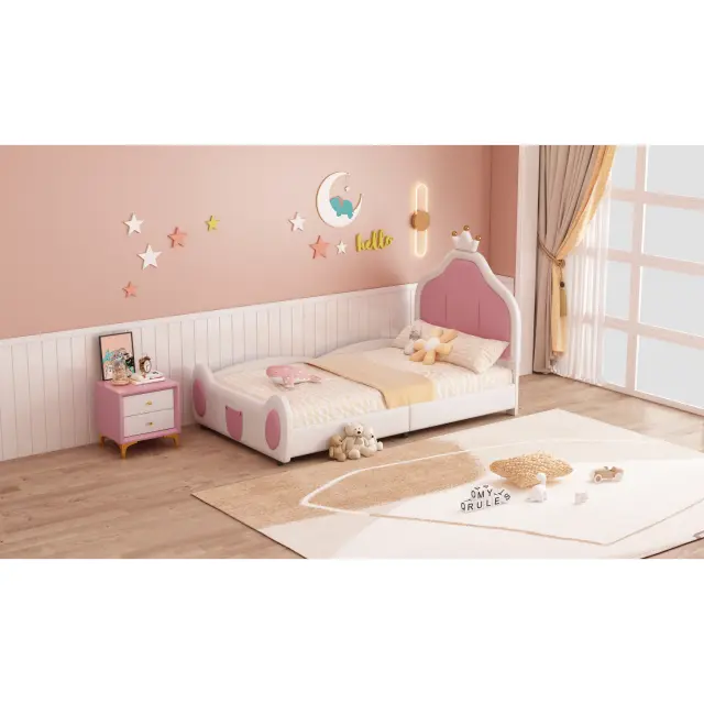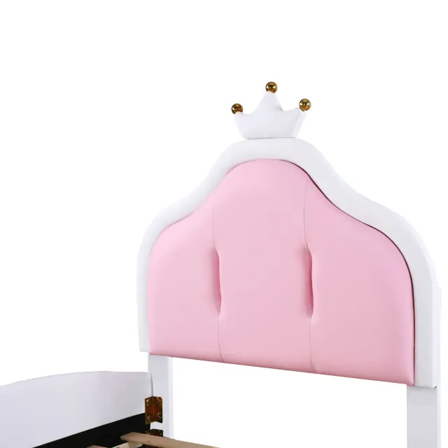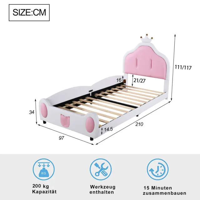 Oblazinjena otroška postelja, 90x200 cm, vzglavje z okrasnimi letvami, umetno usnje, bela