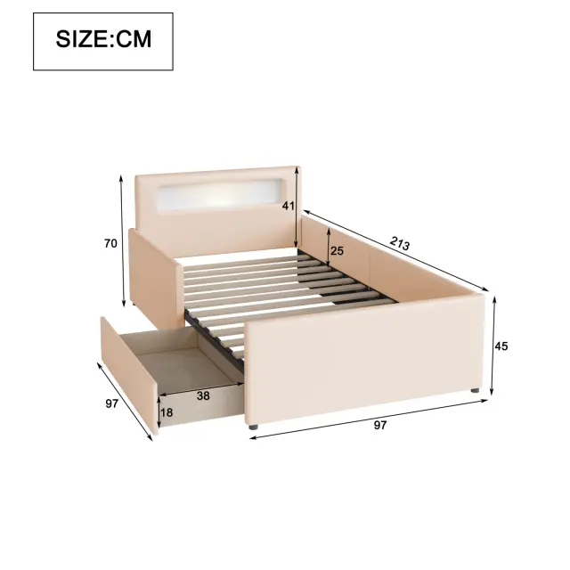 Ta oblazinjena otroška postelja ponuja udobje in varnost z vzmetnico dimenzij 90 x 200 cm, vgrajeno nočno lučko, polnilnim priključkom USB in predali. Na voljo v belem ali bež umetnem usnju.
