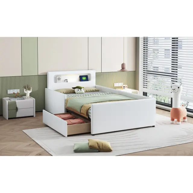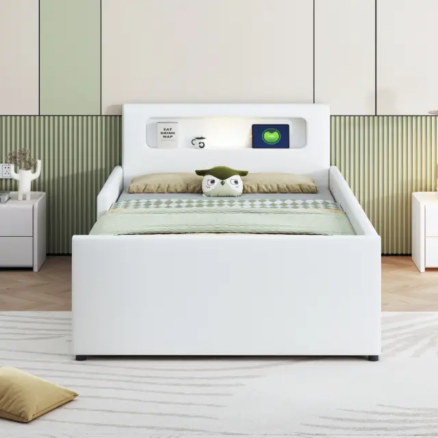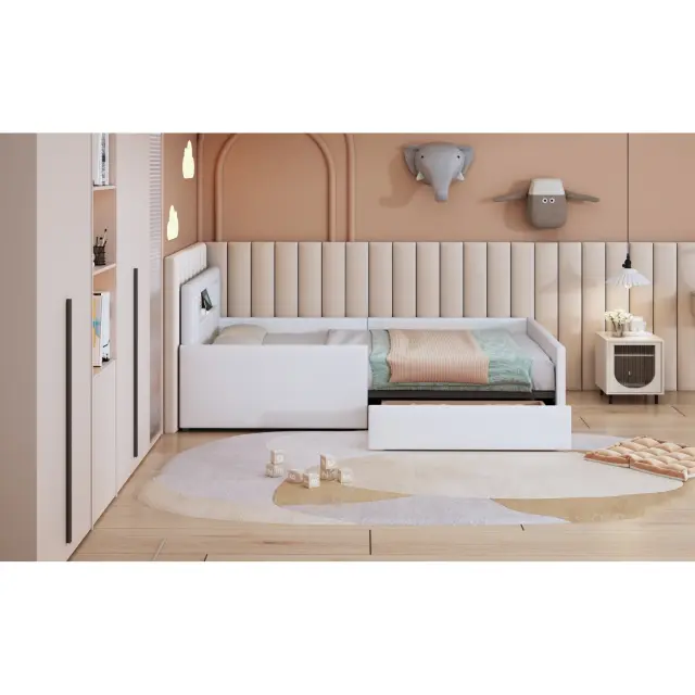 Ta oblazinjena otroška postelja ponuja udobje in varnost z vzmetnico dimenzij 90 x 200 cm, vgrajeno nočno lučko, polnilnim priključkom USB in predali. Na voljo v belem ali bež umetnem usnju.