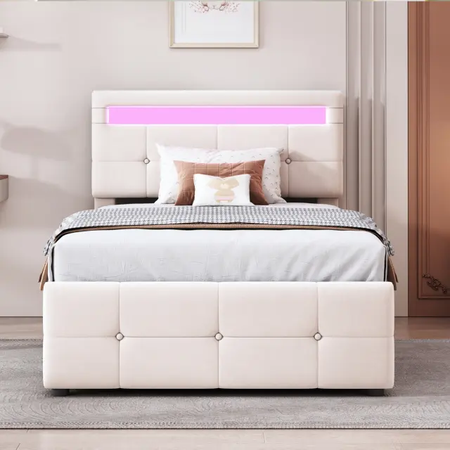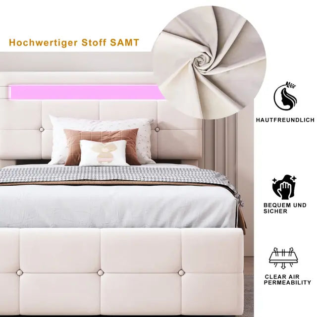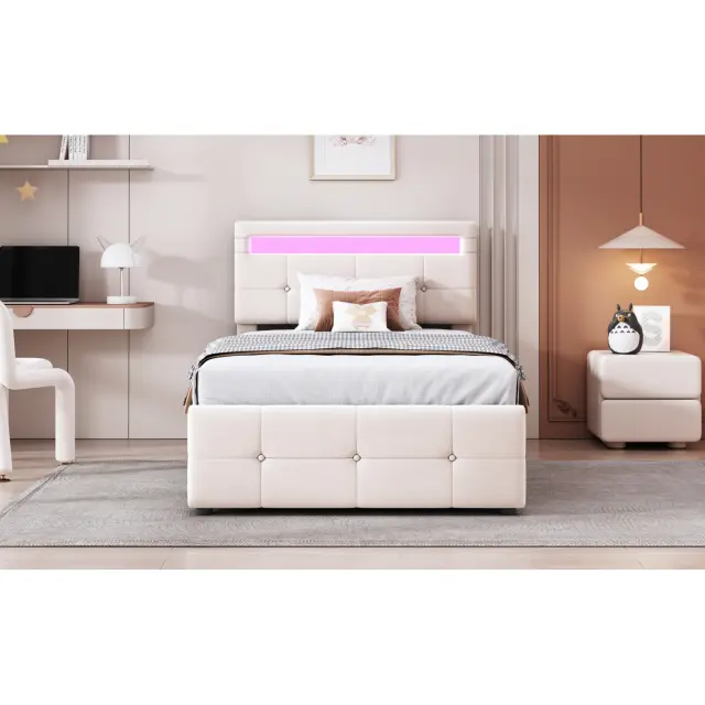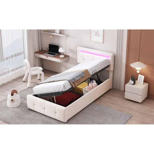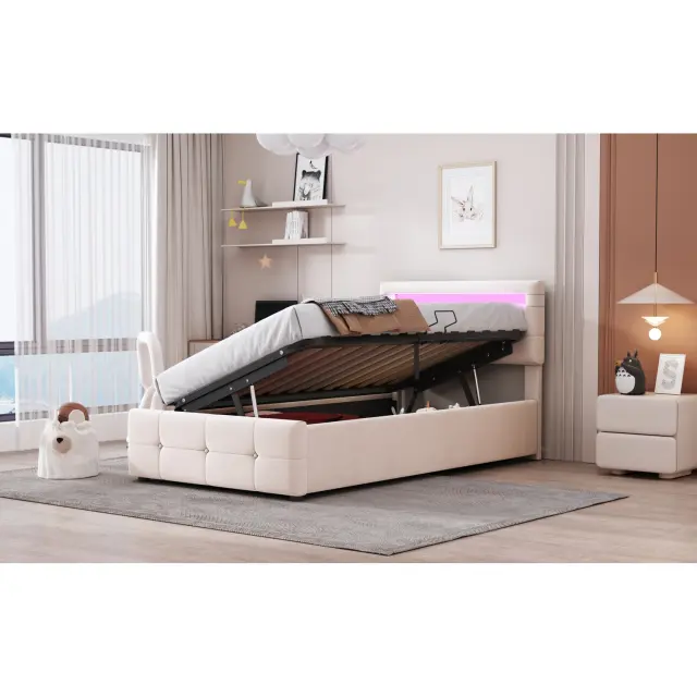Oblazinjena otroška postelja 90x200cm z LED osvetlitvijo, prostorom za shranjevanje, nastavljivim vzglavjem, žametna, bež