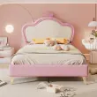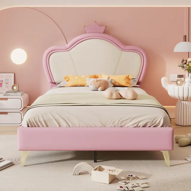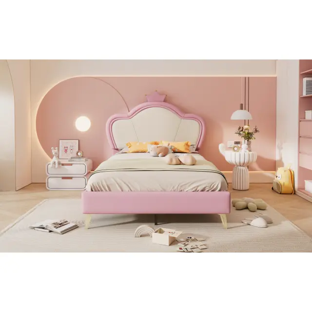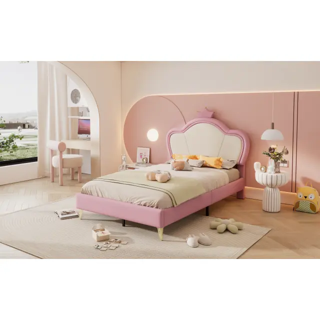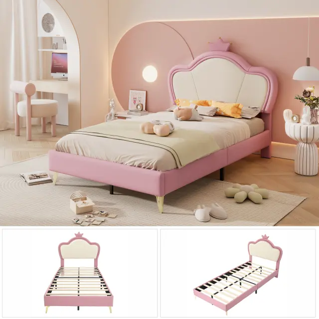 Oblazinjena otroška postelja s krono, kovinske noge, roza in bela, 90x200cm