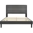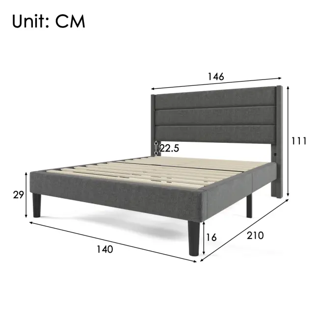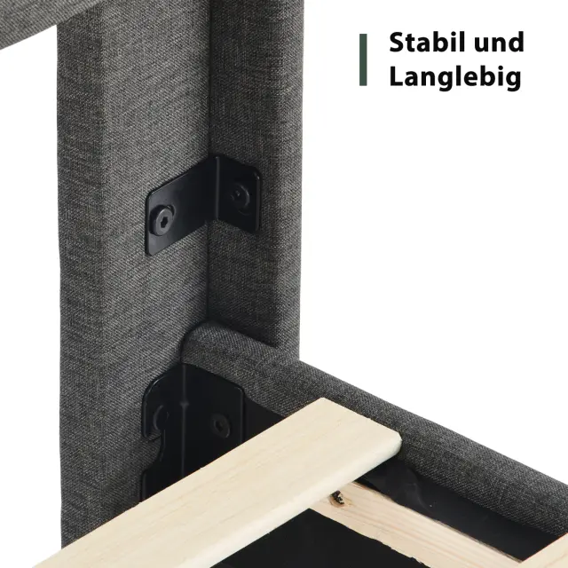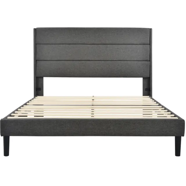 Oblazinjena postelja 140x200 cm, posteljni okvir z letvenim podnožjem in vzglavjem, prevleka iz tekstila temno sivega lana.