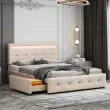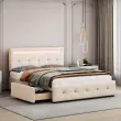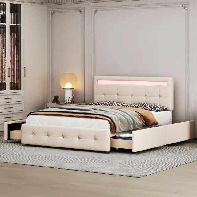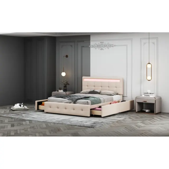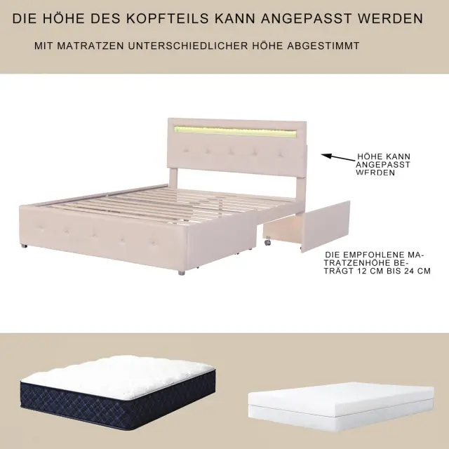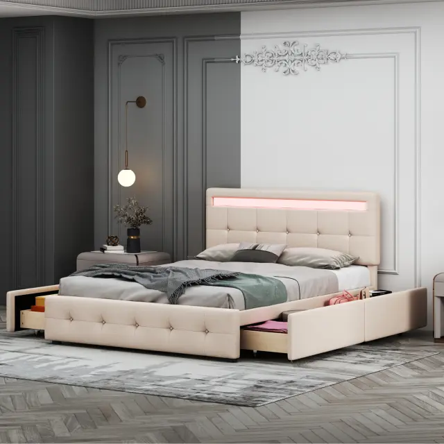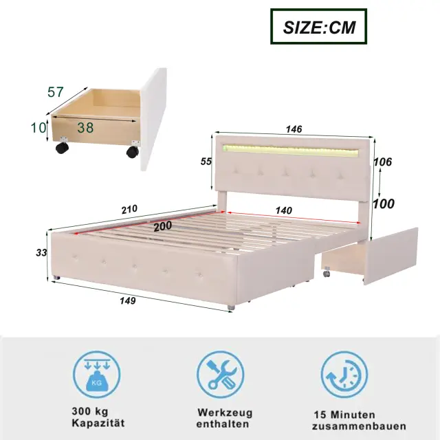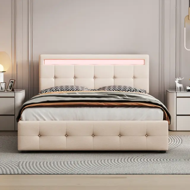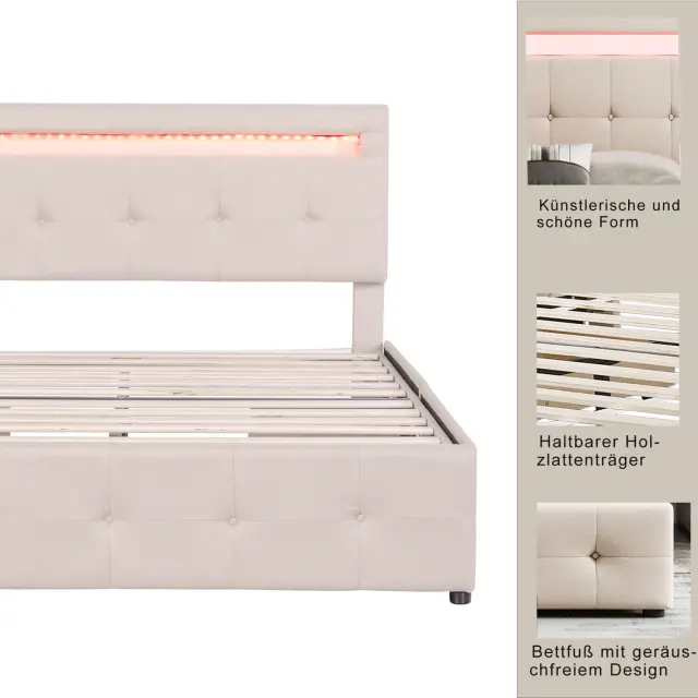 Oblazinjena postelja 140x200cm z LED osvetlitvijo, letveni okvir, predal za posteljnino, vzglavje, 4 predali, platnena površina, bež (brez vzmetnice