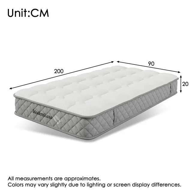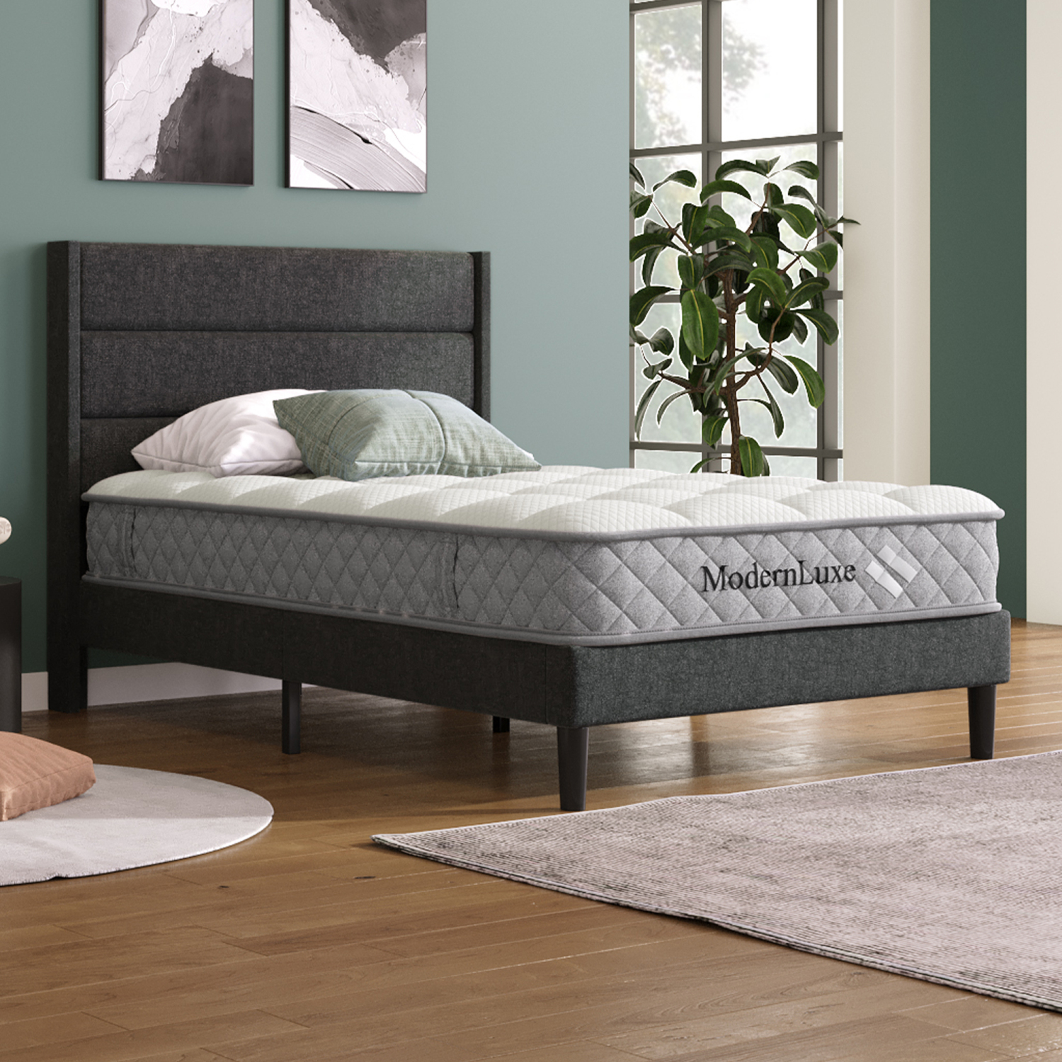 Postelje v sivi in zeleni barvi (90 x 200 cm in 140 x 200 cm) s 7-consko vzmetnico. Opremljene z edinstvenim vzglavjem, 29 cm visoko stransko ograjo in 16 cm prostora za shranjevanje pod posteljo. Največja nosilnost: 113 kg.