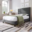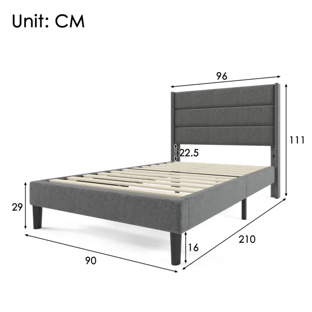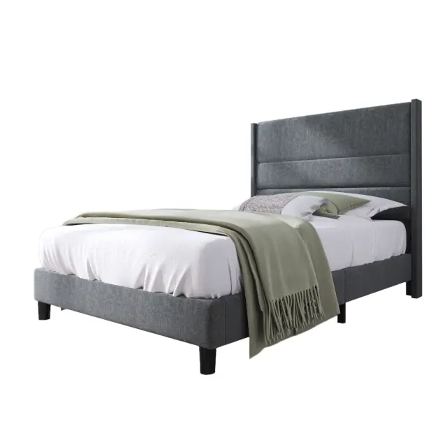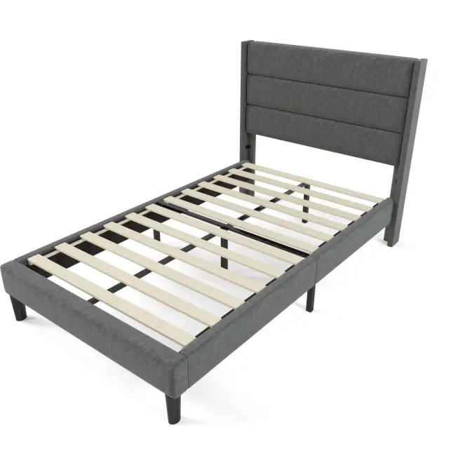 Oblazinjena postelja 90x200 cm, posteljni okvir z letvenim podnožjem in vzglavjem, siva.