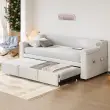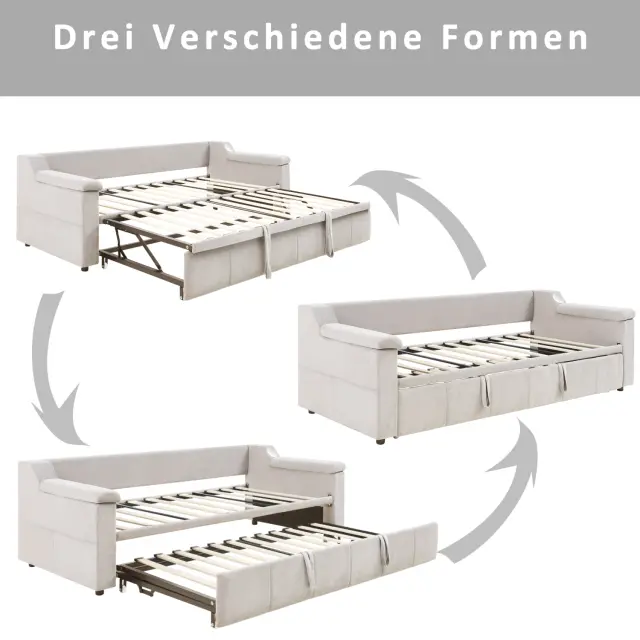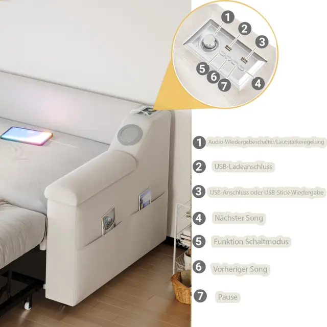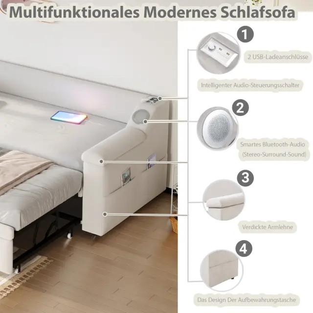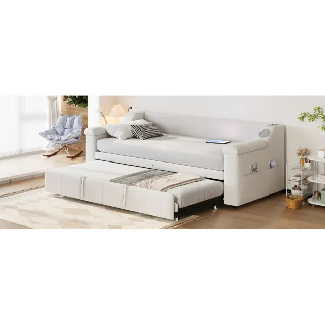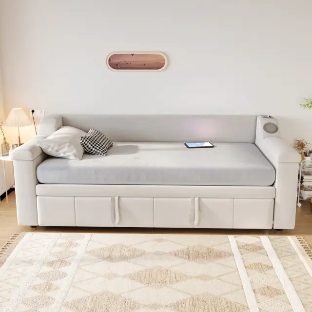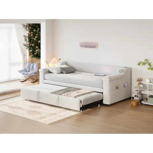 Oblazinjena postelja/raztegljiv kavč 90/180*190 cm, nasloni za roke, Bluetooth, USB, shramba, letvičast okvir, žamet, bež