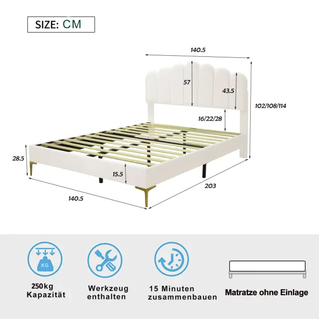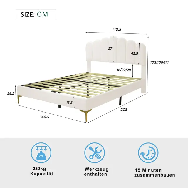 Moderna, elegantna oblazinjena postelja s platformo. Oblazinjeno vzglavje, trden lesen okvir in sistem letvic. Bež/zelena/roza. 203 x 140,5 x 102/114 cm. Nosilnost 250 kg. Enostavna montaža.