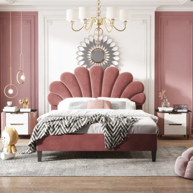 Oblazinjena zakonska postelja 140x200cm, žametno blago, vzglavje z rožicami, letveni okvir, fižolovo rdeča