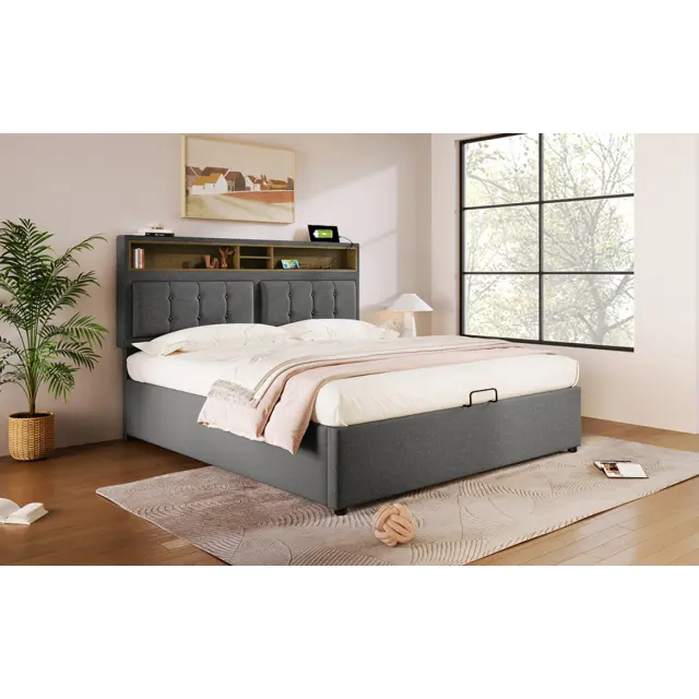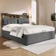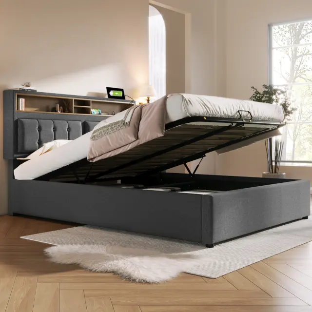 Oblazinjena zakonska postelja z vzglavjem za polnjenje prek USB-C, posteljni okvir s shrambo za posteljnino 160x200 (brez vzmetnice)