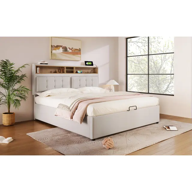 Oblazinjena zakonska postelja z vzglavjem za polnjenje prek USB-C, posteljni okvir s shrambo za posteljnino 160x200 (brez vzmetnice)
