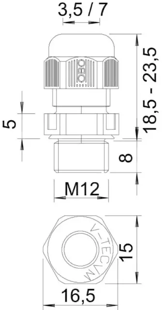 Na voljo z: - Sklopom, ki ga je mogoče namestiti na kabelsko cev: OBO Bettermann Vertr vijačni priključek polni metrični V-TEC VM12 SW, enota pakiranja: 1 kos, EAN: 4012195534013