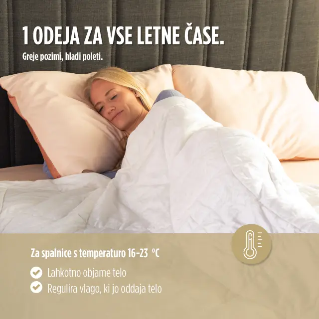 Celoletna odeja Victoria's Silk te razvaja z bogatim volumnom, 100 % naravnimi materiali in zračnostjo v vseh letnih časih. Je najboljša univerzalna izbira za vse leto, saj je najboljša 100 % mulberry svila naravni termoregulator in se prilagaja glede na sezonske temperature. V hladnejših mesecih te greje, v vročih mesecih pa tvoje telo prijetno hladi.