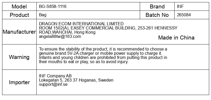 Za zagotovitev stabilnosti izdelka je priporočljivo, da za polnjenje izberete originalni polnilnik 5V-2A znamke ali mobilni napajalnik. Dojenčkom in majhnim otrokom je prepovedano dajati ta izdelek v usta, da bi jedli ali se igrali, da se izognete poškodbam.