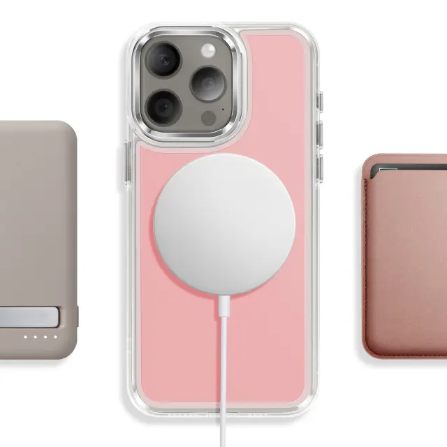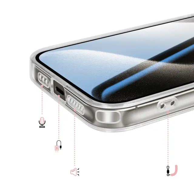Vgrajen magnetni obroč za natančno poravnavo za brezžično polnjenje in uporabo magnetnih pripomočkov, združljivih s sistemom MagSafe. Kombinacija matirane trde hrbtne strani, ki preprečuje praske, in prozorne, ojačane mehke oblike za dobro ravnovesje med slogom in vsakodnevno zaščito.. Ojačani vogali z notranjimi zračnimi blazinami, ki blažijo udarce pri vsakodnevnem rokovanju in padcih.. Rahlo dvignjen, metaliziran okvir kamere, ki pomaga zmanjšati praske na površinah.