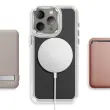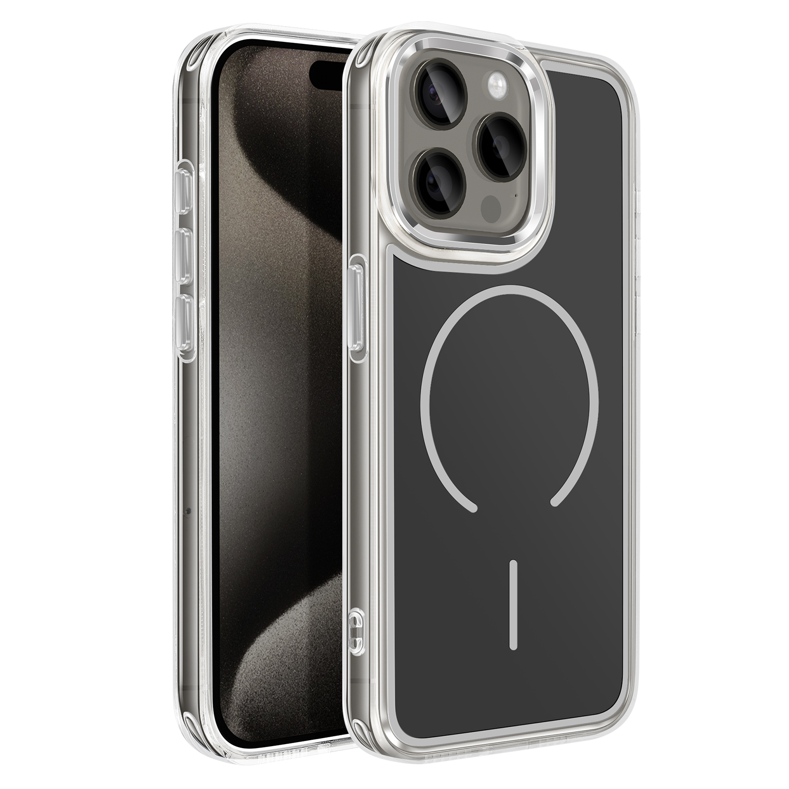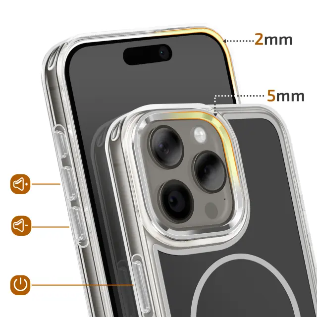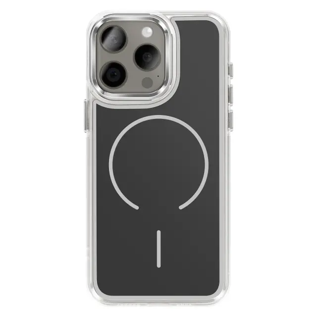 Vgrajen magnetni obroč za natančno poravnavo za brezžično polnjenje in uporabo magnetnih pripomočkov, združljivih s sistemom MagSafe. Kombinacija matirane trde hrbtne strani, ki preprečuje praske, in prozorne, ojačane mehke oblike za dobro ravnovesje med slogom in vsakodnevno zaščito.. Ojačani vogali z notranjimi zračnimi blazinami, ki blažijo udarce pri vsakodnevnem rokovanju in padcih.. Rahlo dvignjen, metaliziran okvir kamere, ki pomaga zmanjšati praske na površinah.