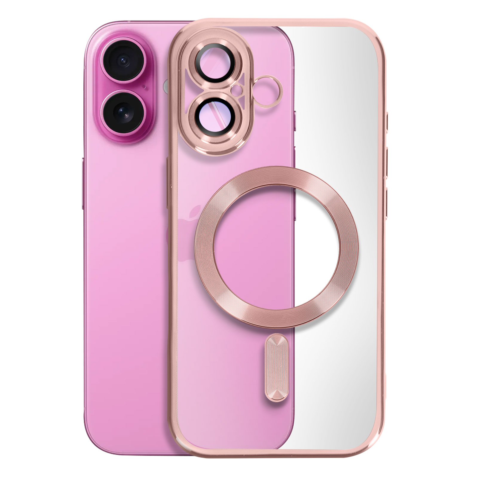 Magnetno ohišje za zaščito vaše [ime naprave], hkrati pa je združljivo z dodatki MagSafe. Popolnoma združljiv z brezžičnim polnjenjem na polnilnem podstavku MagSafe ali polnilnem stojalu. Prozorna hrbtna stran s kromiranim okvirom v barvi rožnatega zlata ustvarja edinstven, prefinjen videz, hkrati pa ohranja estetiko iPhona.. Prilagodljiva, a trpežna oblika iz silikonskega gela, popolnoma odporna na vsakodnevne udarce in praske..