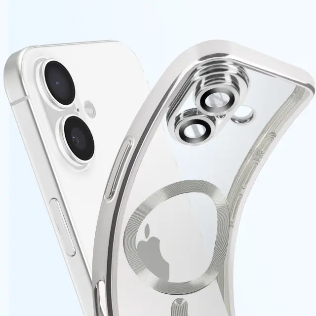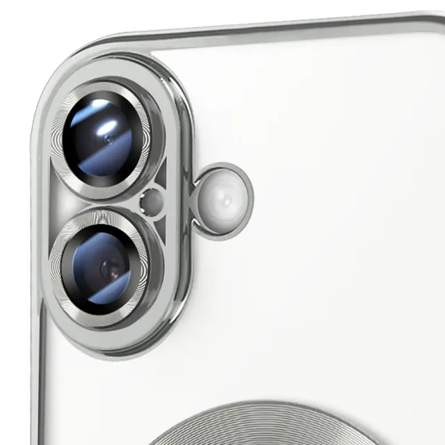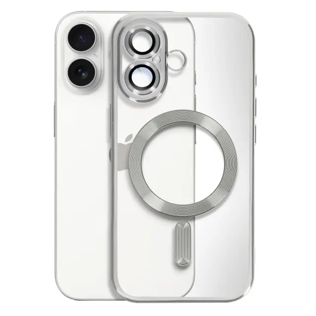 Srebrna kromirana obloga za prefinjen, sodoben videz. Združljiv z MagSafe z vgrajenim magnetnim obročem. Trdna prozorna hrbtna stran izboljša izvirno zasnovo iPhona. Prilagodljiv silikonski gel, odporen na udarce, za učinkovito zaščito.