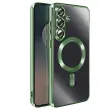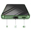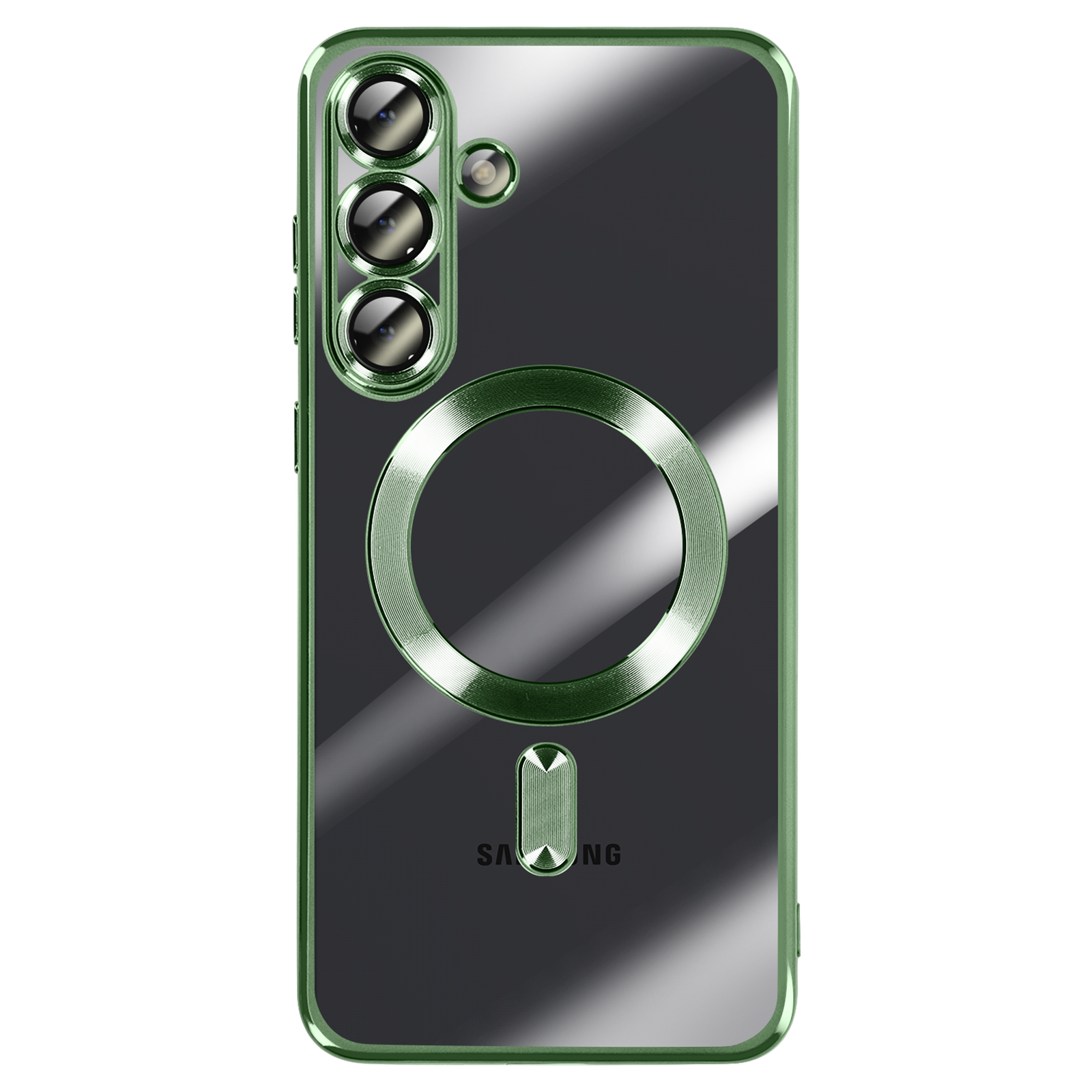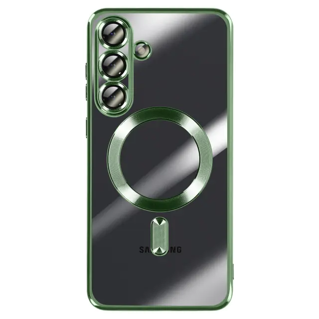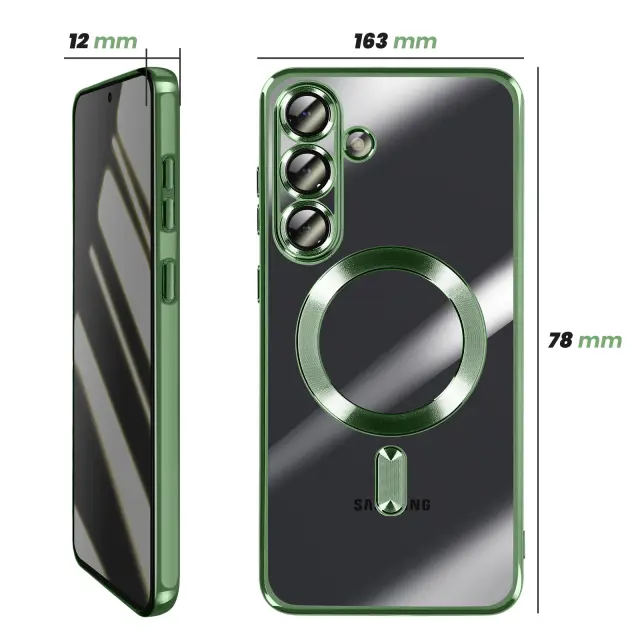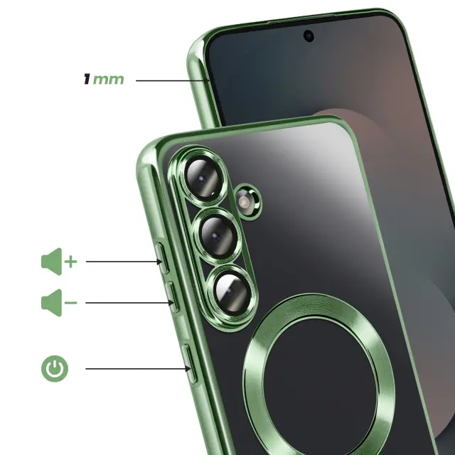 To ohišje za Samsung Galaxy S25 FE ima prozorno silikonsko hrbtno stran z zeleno kromirano obrobo.. Prilagodljiv material absorbira lahke udarce in omogoča enostavno namestitev in odstranitev školjke.. Vgrajen magnetni obroč omogoča združljivost etuija z dodatki MagSafe in brezžičnim polnjenjem. Dvignjeni obročki okoli leč omejujejo neposreden stik med fotografskim modulom in ravnimi površinami..