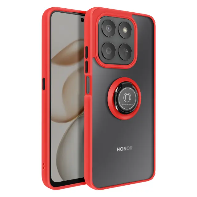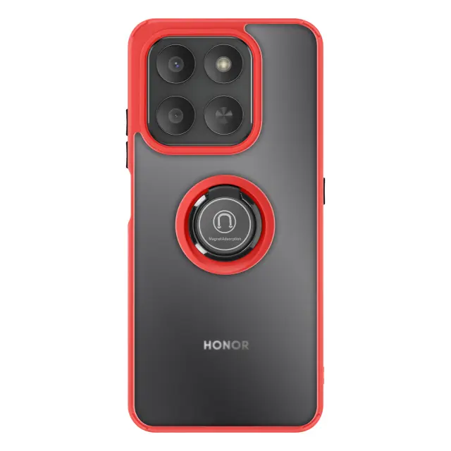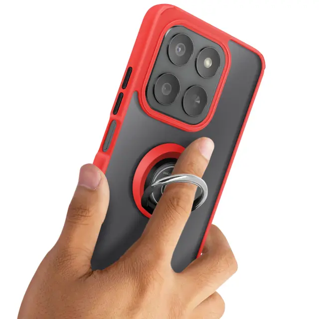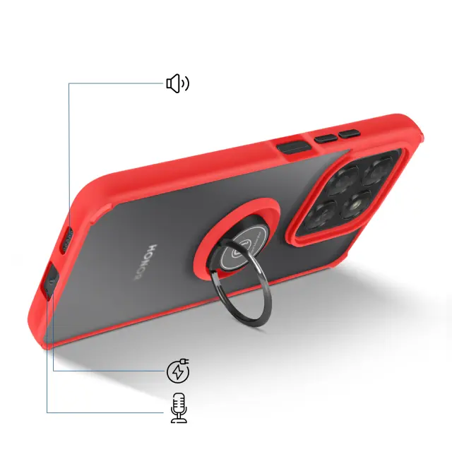 To ohišje za telefon Honor 400 Smart ima trdno hrbtno stran iz matiranega polikarbonata z mat površino, ki je odporna na praske in sledi.. Mehak rdeč okvir TPU obdaja vogale in pomaga absorbirati manjše udarce v vsakdanjem življenju.. Kovinski vrtljivi obroč se vrti za 360° in napravo stabilizira v vodoravnem položaju za ogled vsebine ali opravljanje video klicev.. Zaradi feromagnetnega vložka v obroču je ohišje združljivo z magnetnimi nosilci za avtomobile..