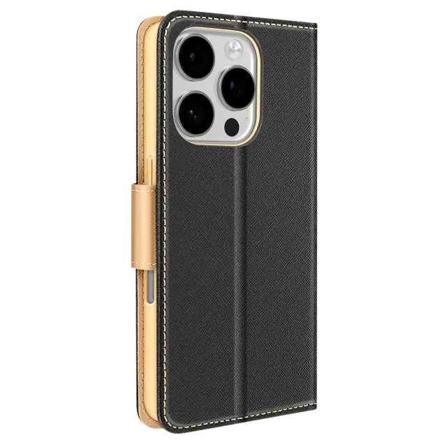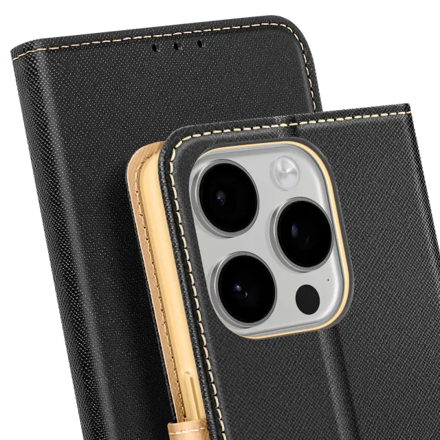 Ohišje za iPhone 16 Pro Wallet Leather Saffiano Fancy, Črna / Zlata