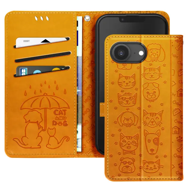 Ohišje za iPhone 16e Design Cat and Dog Wallet Clap, Oranžna