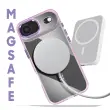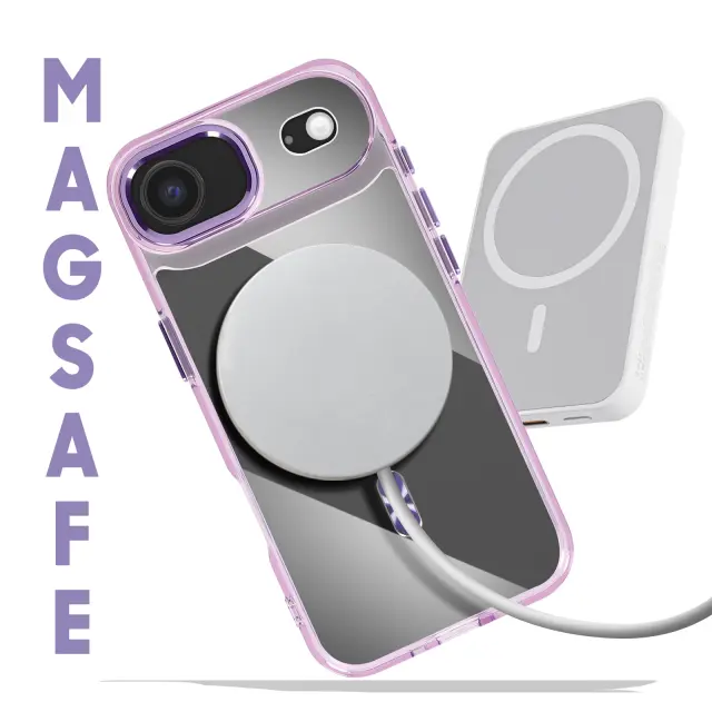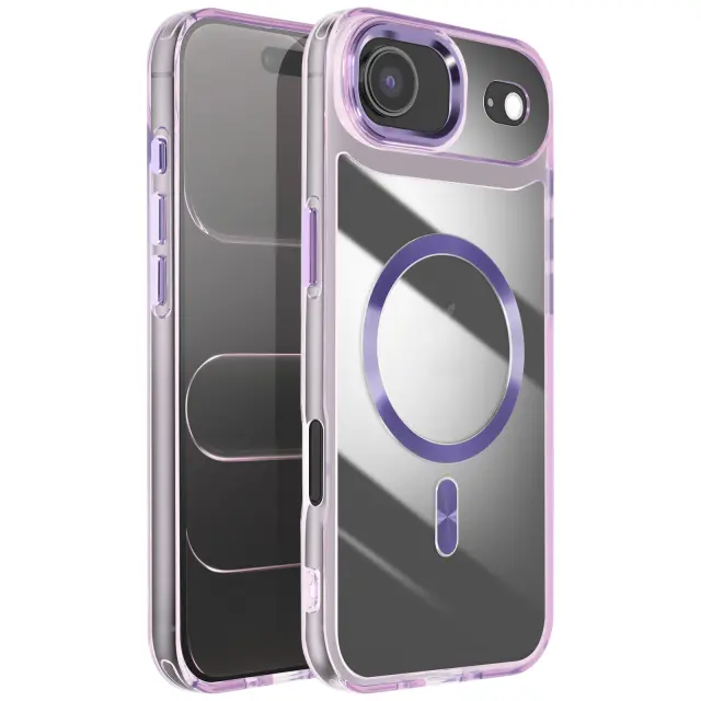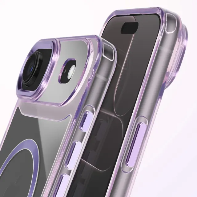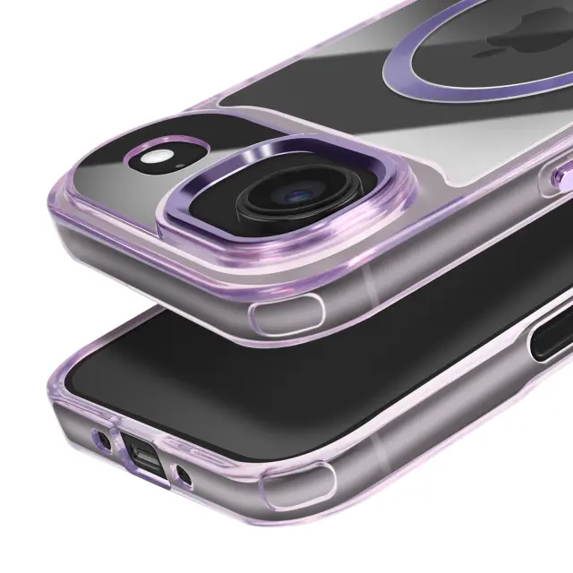 Hibridna struktura s togim hrbtiščem in mehkimi robovi, odpornimi na udarce. Združljiv s sistemom MagSafe za hitro polnjenje in stabilno magnetno pritrditev. Obdelava proti rumenenju za dolgotrajno prozornost. Dvignjen okvir kamere in gumbi s kovinskim učinkom.
