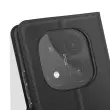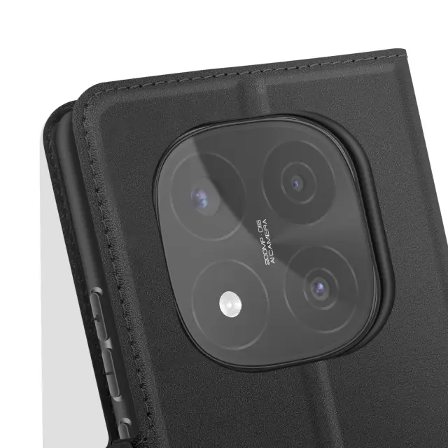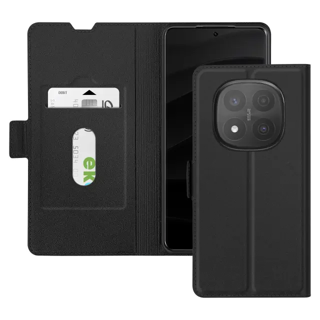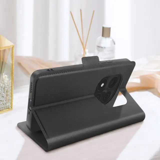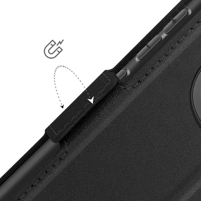 Črno ohišje, posebej zasnovano za popolno zaščito vaše [ime naprave].. Teksturirano oblazinjenje iz umetnega usnja s šivanim zaključkom za eleganten videz. Zagotavlja zanesljivo zaščito pred udarci in praskami, hkrati pa ohranja tanko obliko telefona. Dva magnetna zavihka zagotavljata trden oprijem in preprečujeta nenamerno odpiranje.