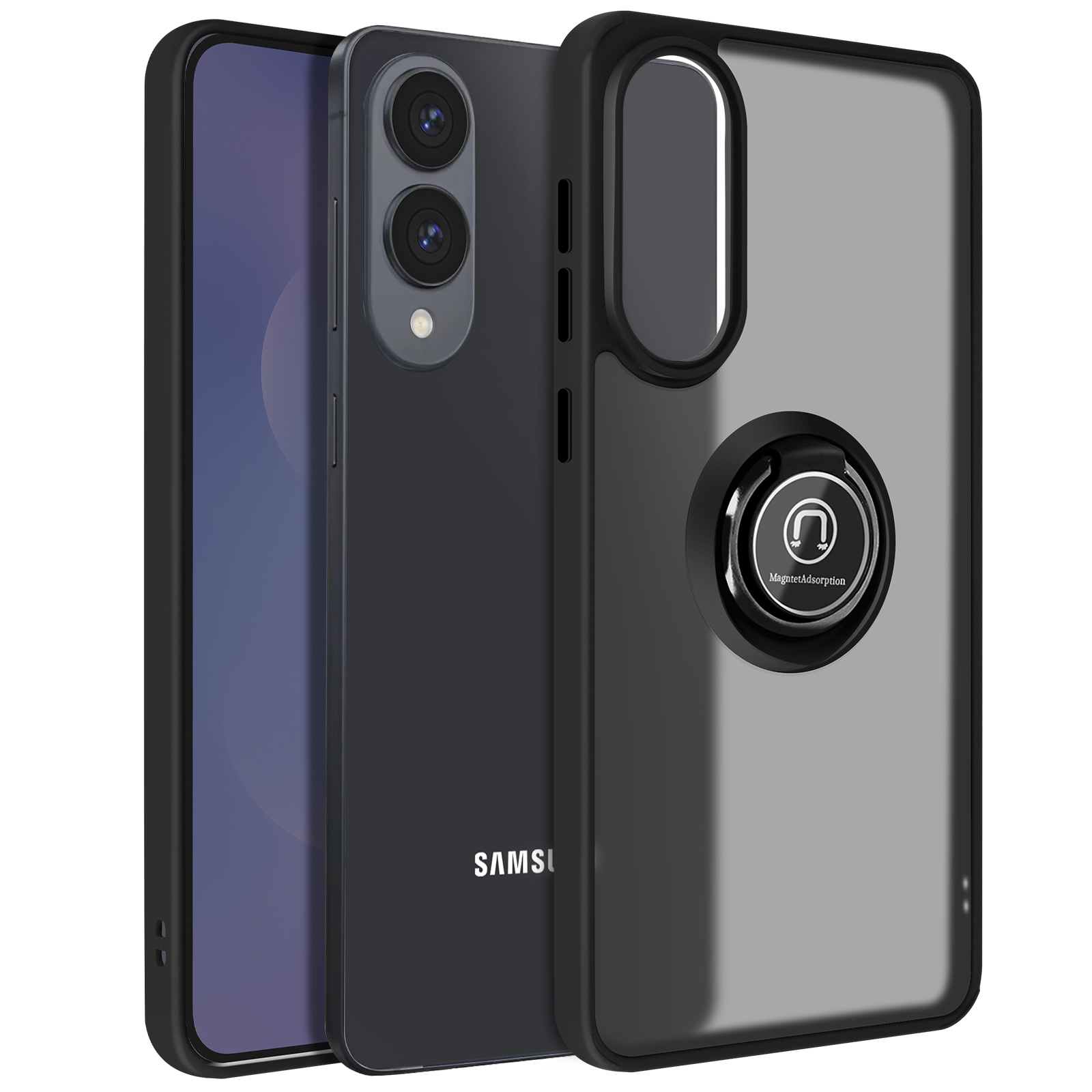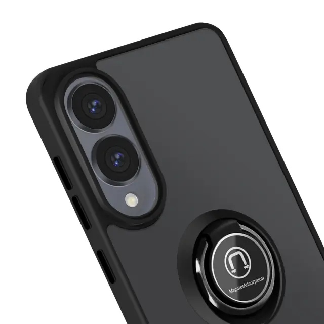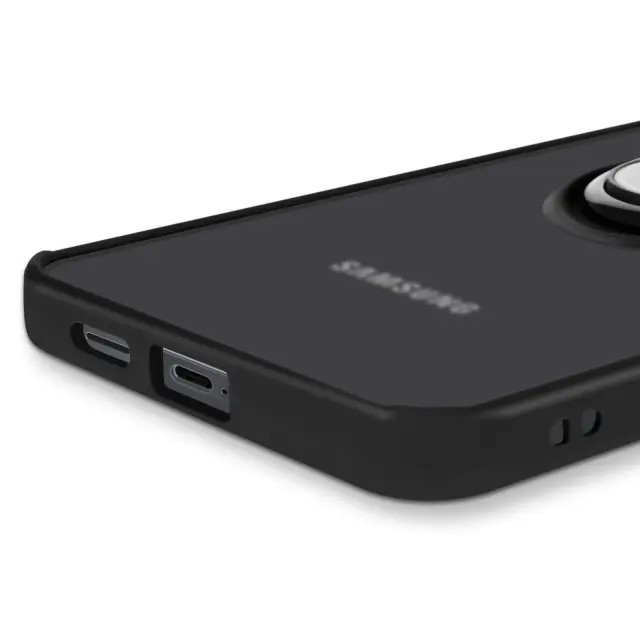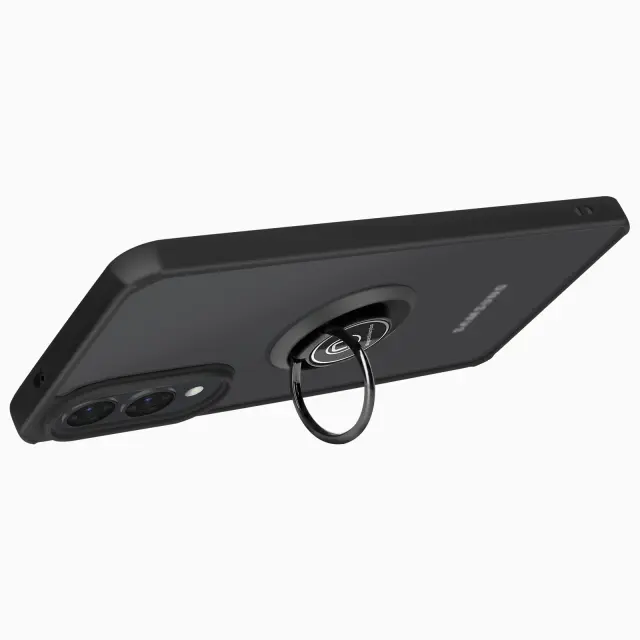 Ohišje z matirano prozorno hrbtno stranjo in črno obrobo, elegantna zaščita za vaš Samsung Galaxy S25 Edge. Večnamenski obroč na hrbtni strani za varen oprijem v vseh okoliščinah. Obroč spremenite v praktično vodoravno ali navpično stojalo, tako da lahko s telefonom uživate, kjer koli ste.. Optimalna zaščita pred nevarnostmi vsakdanjega življenja: udarci, padci in praske ne bodo več vplivali na vaš telefon..