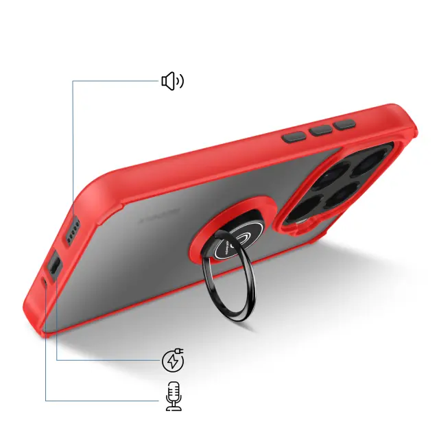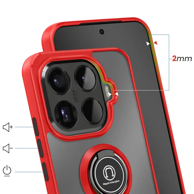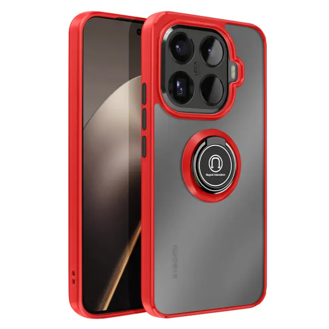 To ohišje za telefon Xiaomi 15T Pro ima trdno hrbtno stran iz matiranega polikarbonata s površino, odporno na praske in madeže.. Mehak rdeč okvir TPU obdaja vogale in pomaga absorbirati blage udarce v vsakdanjem življenju.. Kovinski vrtljivi obroč se vrti za 360° in napravo stabilizira v vodoravnem položaju za ogled vsebine ali opravljanje video klicev.. Zaradi feromagnetnega vložka v obroču je ohišje združljivo z magnetnimi nosilci za avtomobile..