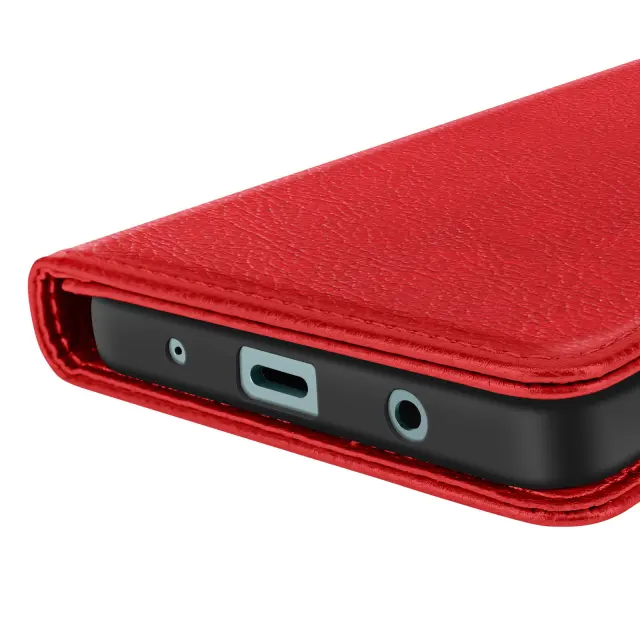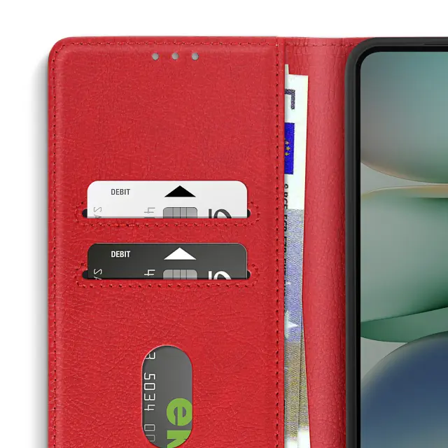 Rdeče ohišje Chesterfield za zaščito telefona Samsung A26 pred praskami in udarci. V imitaciji usnja z zrnatim učinkom, ki pametnemu telefonu daje eleganten in eleganten videz.. Magnetni zavihek drži kovček zaprt za večjo varnost. Vključuje predale za kartice in žep za bankovce.