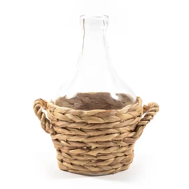 Okrasna steklenica oziroma vaza, višine 23 cm je čudovit primer združevanja naravnih materialov in funkcionalnega dizajna. Izdelana je iz prozornega stekla, kar ji daje eleganten in čist videz. Posebnost te vaze je njen spodnji del, ki je ovit v košaro iz pletenih bananinih listov, kar ji dodaja rustikalen in topel pridih. Kombinacija prozornega stekla in naravno pletenih bananinih listov ustvarja zanimiv kontrast med gladko, prozorno površino in teksturiranim, naravnim videzom košare. Postavite jo na sredino mize, na polico ali na okensko polico kot osrednji dekorativni kos. Uporabite jo za sveže cvetje, suhe rastline ali dekorativne vejice, ki bodo še dodatno poudarile njen naravni videz. Odlična je tudi za shranjevanje drobnih predmetov.