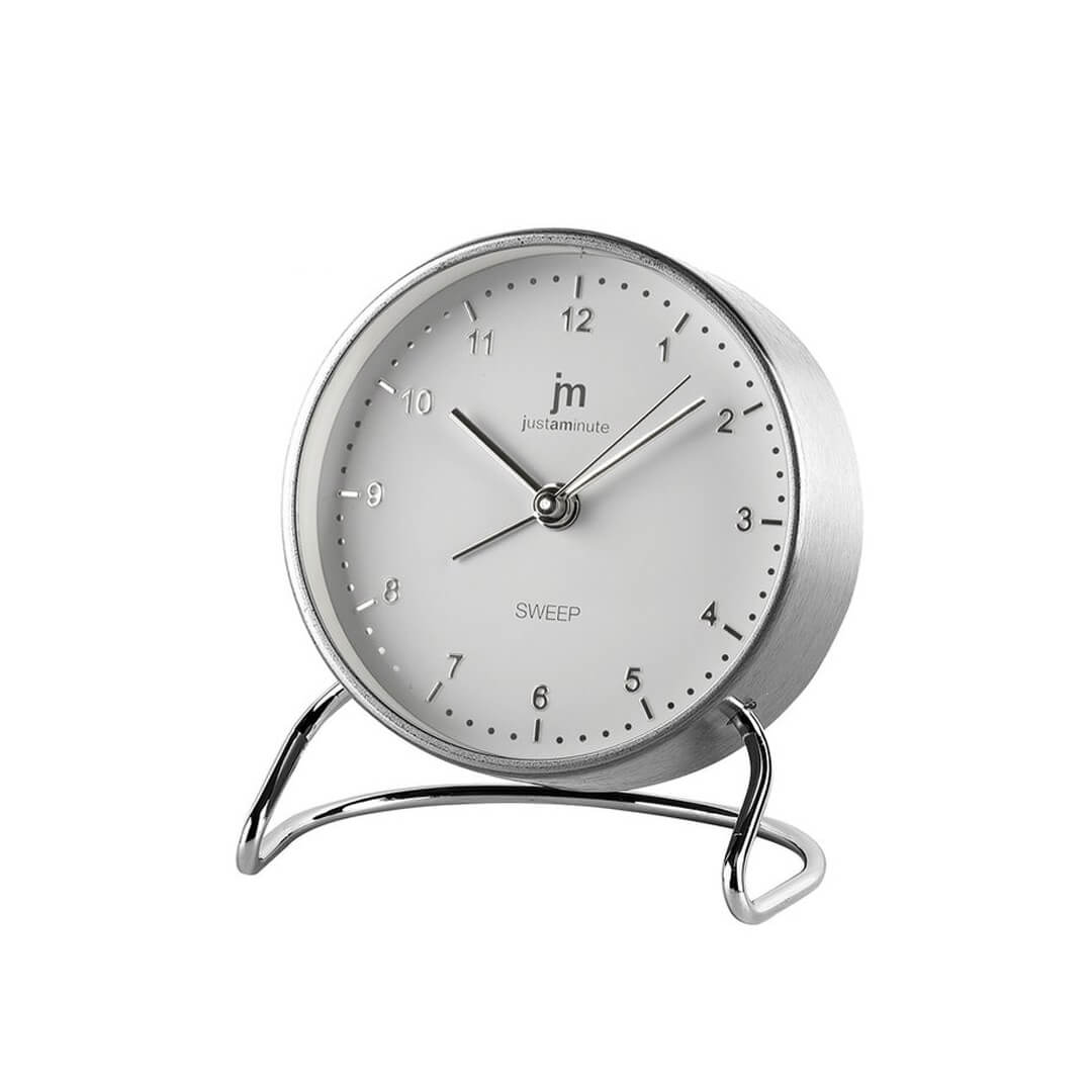 Kvarčna okrogla budilka Bip Bip v sodobnem slogu ima kovinsko srebrno ohišje s številčnico z velikimi reliefnimi arabskimi številkami. Ponaša se z alarmom in tihim mehanizmom z gladkim tekom sekundarnega kazalca (Sweep Movement). Deluje na baterijo tipa AA, ki ni priložena.