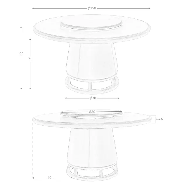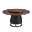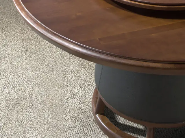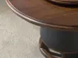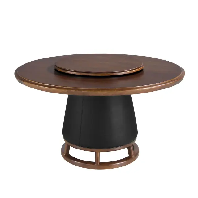 Okrogla jedilna miza iz temnega oreha in lesa, oblazinjena z umetnim usnjem