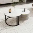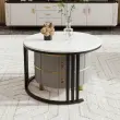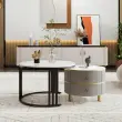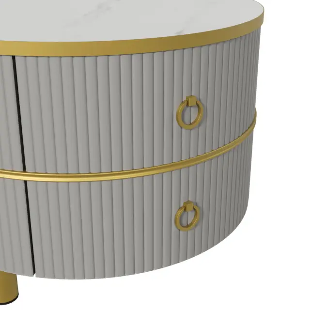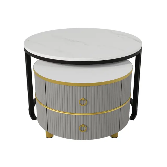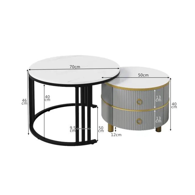 Okrogla klubska mizica 2 v 1 iz MDF s sijočo belo marmorno ploščo, 2 predala, 70x70x46+50x50x40 cm