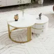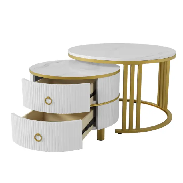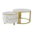 Okrogla klubska mizica 2 v 1 iz MDF s sijočo površino in belo marmorno površino, 2 predala, 70*70*46 + 50*50*40 cm