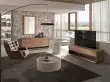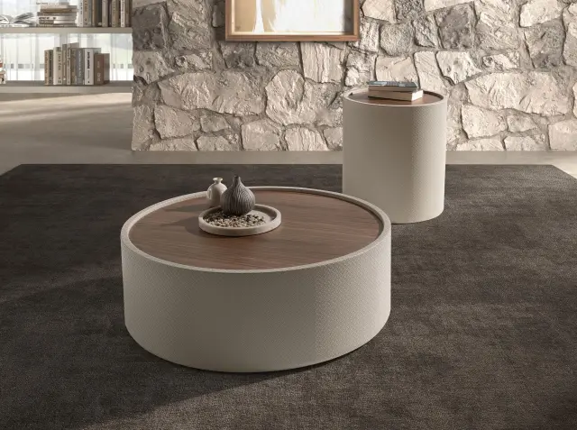 Okrogla klubska mizica iz orehovega lesa in lesa, oblazinjenega v umetno usnje barve peska model 2164 Angel Cerdá S.L.