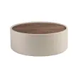 - Zaradi svoje valjaste konstrukcije iz obloženega lesa v teksturiranem umetnem usnju peščene barve ta pomožna mizica izstopa s svojim prefinjenim in sodobnim slogom ter postane dekorativen kos z izrazito osebnostjo.