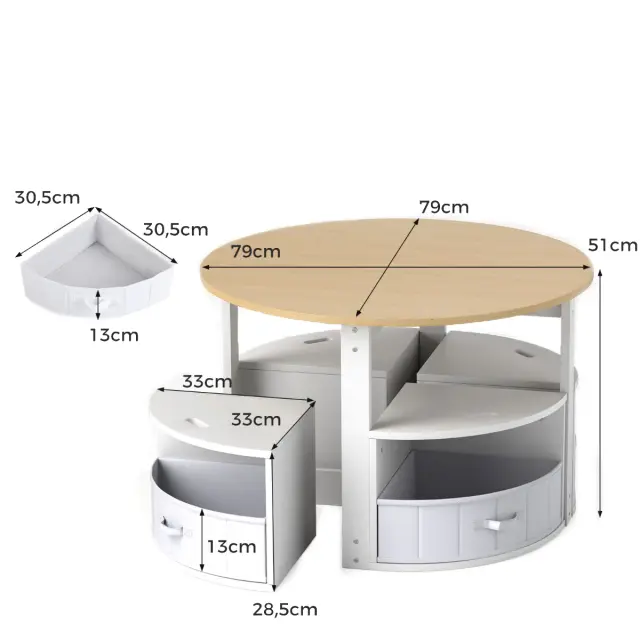 - Komplet vsebuje: 1 x okrogla miza | 4 x stolčki | 4 x predali | 1 x navodila za uporabo