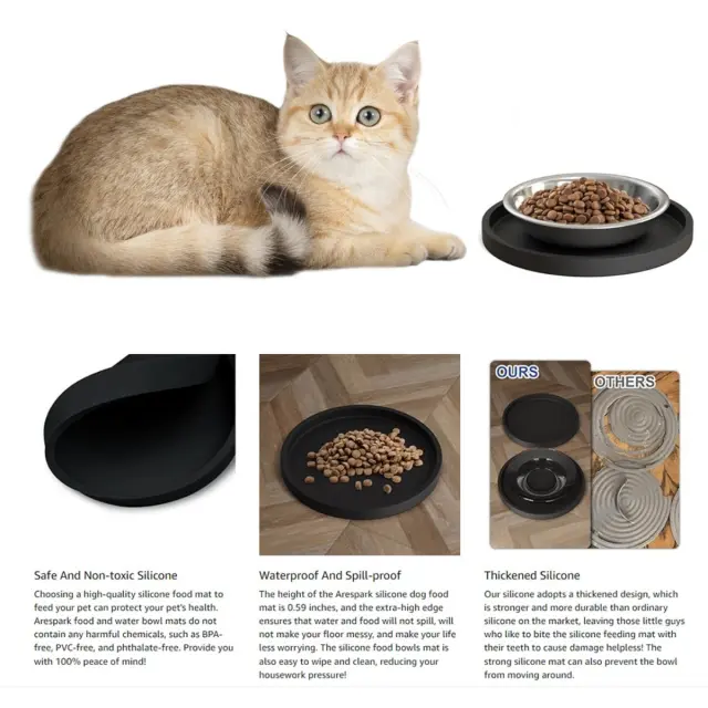 Varna hrana: Izdelana iz vrhunskega silikona za živila, je ta podloga za hranjenje hišnih ljubljenčkov popolnoma varna in nestrupena za vaše hišne ljubljenčke. Lahko ste prepričani, saj veste, da ne bo izpirala nobenih škodljivih kemikalij v njihovo hrano ali vodo. Fleksibilen in mehak silikonski material je nežen do tac vašega hišnega ljubljenčka in preprečuje praske po tleh. Ta podloga, zasnovana tako, da prenese vsakodnevno uporabo, ponuja varno in zanesljivo površino za hranjenje vaših kosmatih prijateljev. Združljiva z različnimi znamkami hrane za hišne živali in vrstami posod, vključno s tistimi, ki so združljive z blagovnimi znamkami, kot je Garmin.