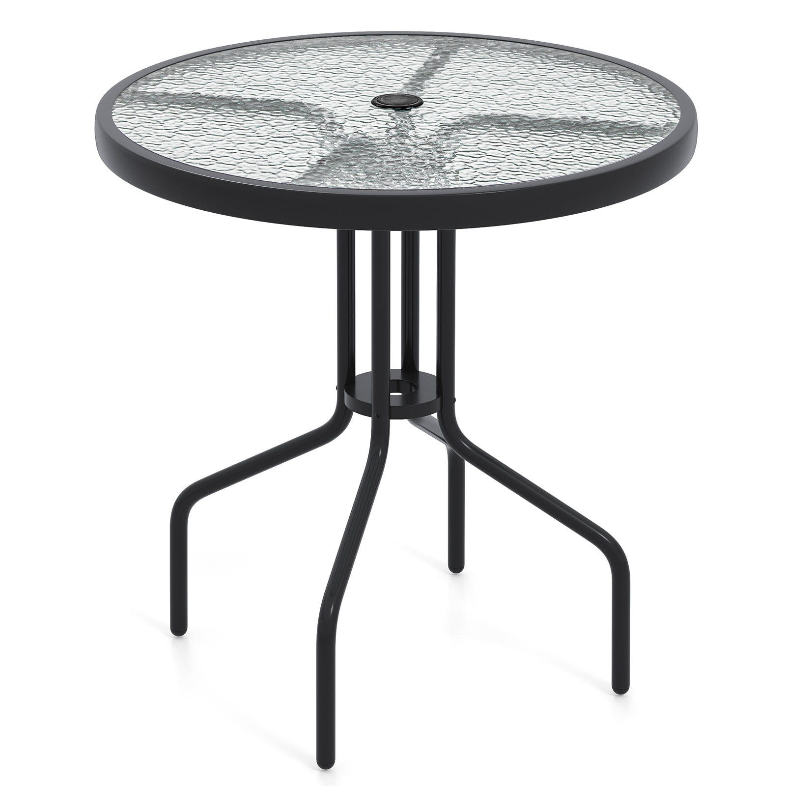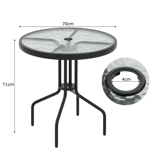 Zaradi rebraste površine iz kaljenega stekla je jedilna miza eleganten in trpežen dodatek za sprostitev. Vgrajena odprtina za senčnik z dodatnimi možnostmi pritrditve zagotavlja senco in udobje v sončnih dneh. Robustna kovinska konstrukcija zagotavlja stabilnost in vzdržljivost, zaradi velikosti mize pa je idealna za prijetna druženja ali mirne obroke v majhnih prostorih. Vsestranska in elegantna miza s premišljenimi podrobnostmi izboljša funkcionalnost in estetiko zunanjih in notranjih prostorov, zato je odlična izbira za sprostitev.