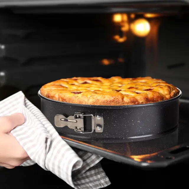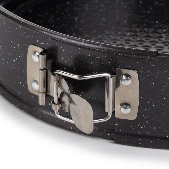 Okrogli pekač Rosmarino BakerPRO je vse, kar potrebuješ za popolno peko tort, biskvitov, pit ali drugega peciva. Pekač v izgledu marmorja ima snemljiv obod z nerjavečo zaklopko, ki omogoča enostavno odpiranje in zapiranje pekača ter hitro odstranjevanje oboda. Neoprijemljiv premaz ILAG švicarske kakovosti poskrbi za enakomerno razporeditev toplote in peko z minimalno maščobe, saj se hrana ne oprijema pekača. Zaradi sestave iz karbonskega jekla je pekač odporen tudi na visoke temperature, do 230 °C, primeren za hrambo v hladilniku in zamrzovalniku. Trpežna in zanesljiva zasnova za profesionalne pekovske rezultate.