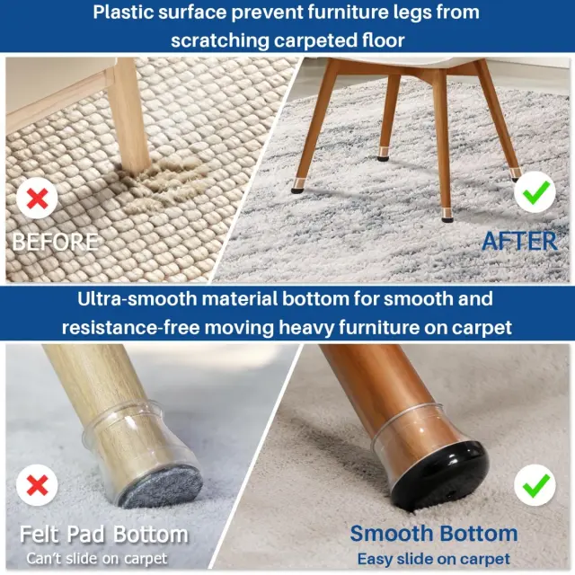 Enostavna namestitev in varno prileganje: Prosimo, upoštevajte: to niso originalni deli. Ti ščitniki za noge stolov so zasnovani za enostavno namestitev. Preprosto raztegnite elastične silikonske pokrove čez noge pohištva za tesno in varno prileganje. Izboljšana zasnova podstavka ohranja ščitnike trdno na mestu, preprečuje zdrsavanje ali padanje, tudi pri pogosti uporabi. Prozorna zasnova se neopazno zlije z vsakim dekorjem in zagotavlja diskretno, a učinkovito zaščito za vaše pohištvo in tla. Odstranjevanje je prav tako enostavno in ne pušča ostankov.