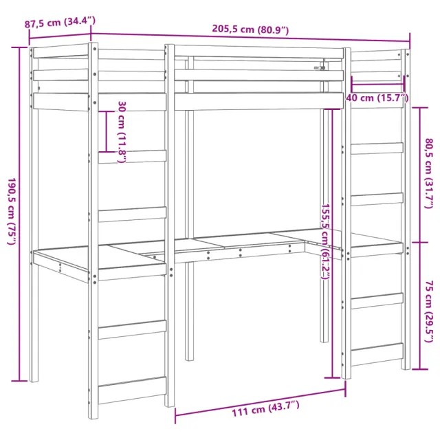 Ta vsestranska dvignjena postelja združuje enojno posteljo in pisalno mizo ter tako zagotavlja udoben prostor za spanje in prostoren delovni prostor. To je idealna izbira za domove z omejenim prostorom.Stabilen in dolgotrajen okvir: Trdna borovina je znana po svoji trdnosti in trajnosti. Ravni vzorci in značilni vozli prispevajo k njenemu rustikalnemu čaru.Povečajte izkoriščenost prostora: Ta posteljni okvir ima pod seboj pisalno mizo, ki učinkovito izkorišča prostor pod posteljo in zagotavlja udoben prostor za delo in učenje. To je idealna izbira za manjše ali bolj omejene prostore.Zlahka se povzpnete in spustite: Ta posteljni okvir ima vgrajeni dve lestvi, ki uporabnikom omogočata udoben dostop za plezanje navzgor in navzdol.Varovalne ograje za večjo varnost: Ta posteljni okvir je opremljen z varovalnimi ograjami, ki preprečujejo, da bi med spanjem padli s postelje.Podnožje z letvami za optimalno podporo: Za podporo in zračnost ležišča je posteljni okvir opremljen z letvenim dnom.Opozorilo:Za preprečitev prevračanja je treba ta izdelek uporabiti s priloženo napravo za pritrditev na steno.Dobro je vedeti:Vzmetnica ni priložena tej postelji. Ponujamo različno izbiro ležišč. V naši trgovini si lahko ogledate ustrezne vzmetnice.Vijaki in čepi za notranjost stene niso priloženi. Svetujemo vam, da poiščete in uporabite vijake in zatiče, ki so primerni za vaše stene. Če niste prepričani, se lahko posvetujete s strokovnjakom. Preberite in upoštevajte vse korake v navodilih.Barva: Voščeno rjavaMaterial: Trdna borovinaCelotne dimenzije: 205,5 x 87,5 x 190,5 cm (D x Š x V)Višina spalnega prostora, merjena od tal: 155,5 cmVišina zaščitne ograje: 26 cmVelikost primerne vzmetnice: 80 x 200 cm (Š x D) (vzmetnica ni priložena)Največja debelina vzmetnice: 12 cmNajvečja nosilnost (z vzmetnico): 80 kgZ letvenim podomZ 2 lestvamaPotrebno sestavljanje: Da