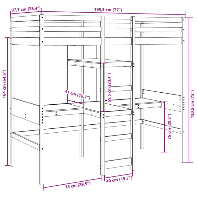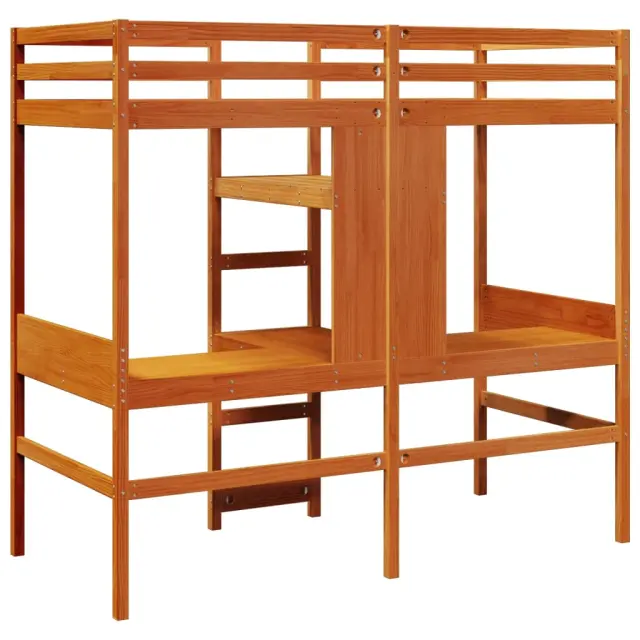 Ta vsestranski pograd združuje enojno posteljo z mizami in policami ter tako zagotavlja udoben prostor za spanje, prostorno delovno površino in učinkovito rešitev za shranjevanje. To je idealna izbira za domove z omejenim prostorom. Stabilen in dolgotrajen okvir: Trdna borovina je znana po svoji trdnosti in trajnosti. Ravni vzorci in značilni vozli prispevajo k njenemu rustikalnemu čaru. Povečajte izkoriščenost prostora: Ta posteljni okvir ima pod seboj dve pisalni mizi in dve polici, kar omogoča učinkovito uporabo prostora pod posteljo in zagotavlja veliko prostora za shranjevanje vsakodnevnih predmetov, hkrati pa ustvarja prijeten prostor za delo in učenje. To je idealna izbira za manjše ali bolj omejene prostore. Zlahka se povzpnete in spustite: Ta posteljni okvir ima vgrajeno lestev, ki uporabnikom omogoča udoben dostop do postelje. Varovalne ograje za večjo varnost: Ta posteljni okvir je opremljen z varovalnimi ograjami, ki preprečujejo, da bi med spanjem padli s postelje. Podnožje z letvami za optimalno podporo: Za podporo in zračnost ležišča je posteljni okvir opremljen z letvenim dnom. Opozorilo: Za preprečitev prevračanja je treba ta izdelek uporabiti s priloženo napravo za pritrditev na steno. Dobro je vedeti: Vzmetnica ni priložena tej postelji. Ponujamo različno izbiro ležišč. V naši trgovini si lahko ogledate ustrezne vzmetnice. Vijaki in čepi za notranjost stene niso priloženi. Svetujemo vam, da poiščete in uporabite vijake in zatiče, ki so primerni za vaše stene. Če niste prepričani, se lahko posvetujete s strokovnjakom. Preberite in upoštevajte vse korake v navodilih.Barva: Voščeno rjavaMaterial: Trdna borovinaCelotne dimenzije: 195,5 x 97,5 x 190,5 cm (D x Š x V)Višina spalnega prostora, merjena od tal: 155,5 cmVišina zaščitne ograje: 26 cmDimenzije pisalne mize: 77 x 41 cm (D x Š)Dimenzije police: 80 x 45,5 cm (D x Š)Velikost primerne vzmetnice: 90 x 190 cm (Š x D) (vzmetnica ni priložena)Največja debelina vzmetnice: 12 cmNajvečja nosilnost (z vzmetnico): 80 kgZ letvenim podomPotrebno sestavljanje: Da